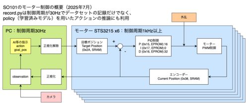 TL;DR SO-101はAI(VLAなどの基盤モデルやACTなどの模倣学習)の指示からモーター内部の制御によって指定した位置に移動している。 指示通りの位置へ移動できることは外乱、構造、制御の特性の影響があるので当たり前ではない。 SO-101はAIが指示した位置に…