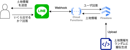 FireStoreをデータベースとして、土地情報とユーザの回答メッセージを保存します。(厳密にはユーザの回答ステータスのようなものも管理します) CloudFunctionsは、ユーザのメッセージに応じて、Firestoreにアクセスして会話文を作る機能を担います。