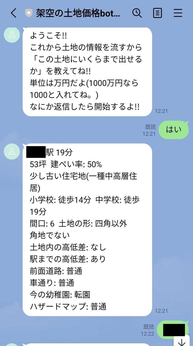 土地情報をbotが送信→いくら出せるかユーザーが回答→次の土地情報をbotが送信→.....