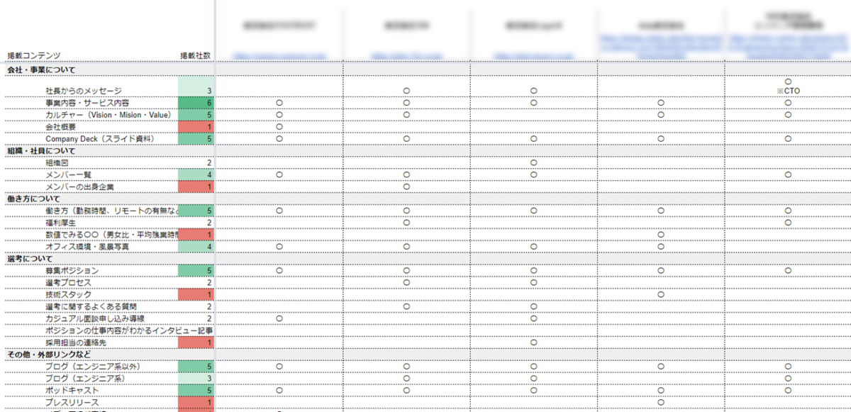 いきなりNotionを触る前に、まずは他社さんのNotion採用サイトをいくつかピックアップして、各社が候補者に対してどんな情報を提供しているのかリストアップしていきます。