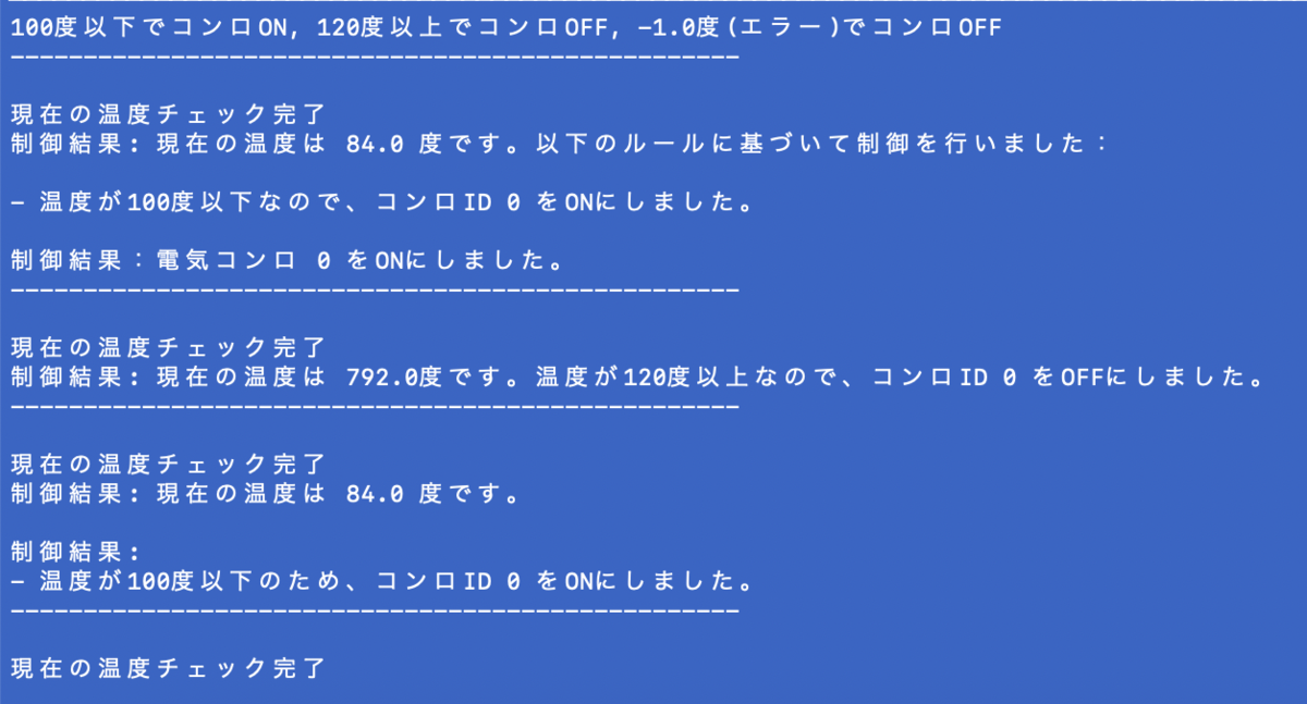 温度センサーの読み取りに失敗した場合に備えて、MCPサーバー側では -1.0℃ をエラーコードとして返すようにしました。プロンプト側ではこの値を検知すると即座に電気コンロの出力を停止するよう指示しており、異常時でも安全に制御が落ちるようにしています。