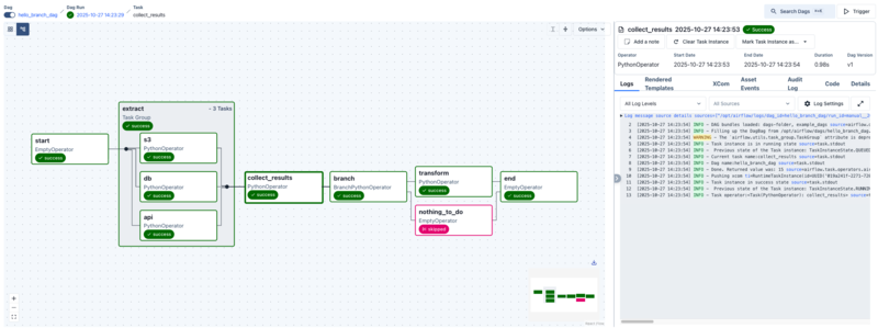 ただ、この構成だけでは Airflow の利点が伝わりにくいため、TaskGroup を使ってタスクをグルーピングし、条件に応じて分岐させる構成にしました。分岐は BranchPythonOperator で実装しましたが、分岐しなかった側が SKIPPED となるため、そのままだと合流時に実行が止まってしまいます。そこで、終端(end)をデフォルトの trigger_rule=all_success のままにせず、合流ノードの trigger_rule を緩和することで、正常に完了するように調整しました。 定期的にデータを取得したり、モデルの学習・評価・レポート生成といった、「決まった順番で自動的に実行したい処理」を Airflow に任せるのはとても相性が良いと感じました。複雑な依存関係があっても、UI から状況を確認しながら安心してワークフローを回せるのが嬉しいポイントです。 ABEJAは、テクノロジーの社会実装に取り組んでいます。 技術はもちろん、技術をどのようにして社会やビジネスに組み込んでいくかを考えるのが好きな方は、下記採用ページからエントリーください! (新卒の方やインターンシップのエントリーもお待ちしております!)