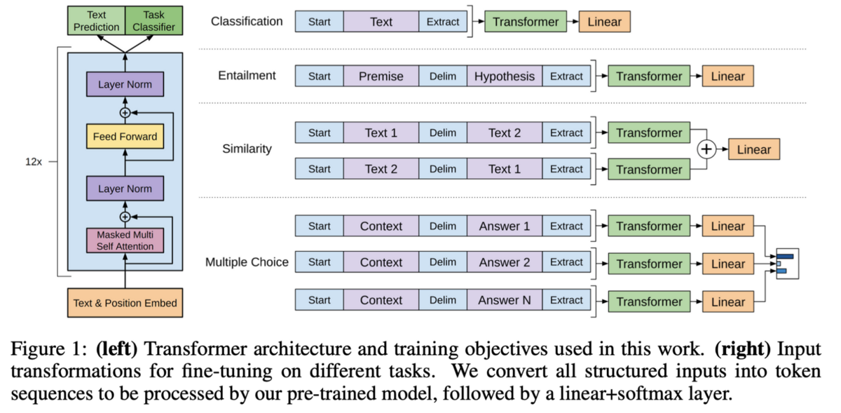 Transformer では CNN のような畳み込み構造で入力データを抽象化しない特性上、従来の CNN のようなネットワークと比較して、十分な品質を発揮するには非常に大量のアノテーションされた学習用データセットが必要になる(現実的にこの規模のデータセットを収集するのは困難)というデメリットがあるのですが、GPT-1 ではアノテーションした学習用データセットなくとも単に多量のテキストがあれば良いだけになるので、この教師なしデータセットで学習可能というのは非常にデカいメリットになります。