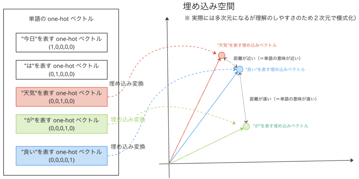 NLP においては、上記単語の one-hot ベクトル表現における問題を解決するために one-hot ベクトルを更に単語の分散表現(=埋め込み表現)という方法で、埋め込みベクトルに変換します。