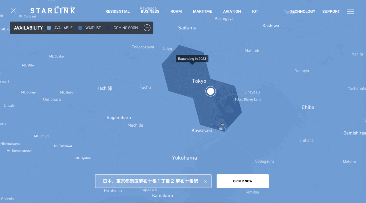 残念ながらオフィスでの実験ではインターネットにつなぐことができませんでした。周りのビルの遮蔽物が影響か?と思い、位置を変えながら十数時間粘ってみたものの、最終的にインターネット接続を確立できませんでした。ここで残念な事実を知る事になります。改めてサービス提供エリアを確認したところ、2023年3月現在だとABEJAの本社がある港区はサービス提供範囲外でした。