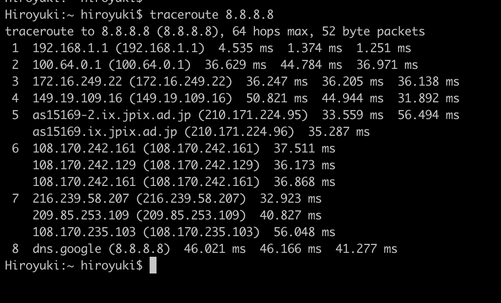 tracerouteを実行してみました。今回、Google Public DNS Serverをお借りしました。ザクっとですが、下記のような経路でパケットが出ているようです。